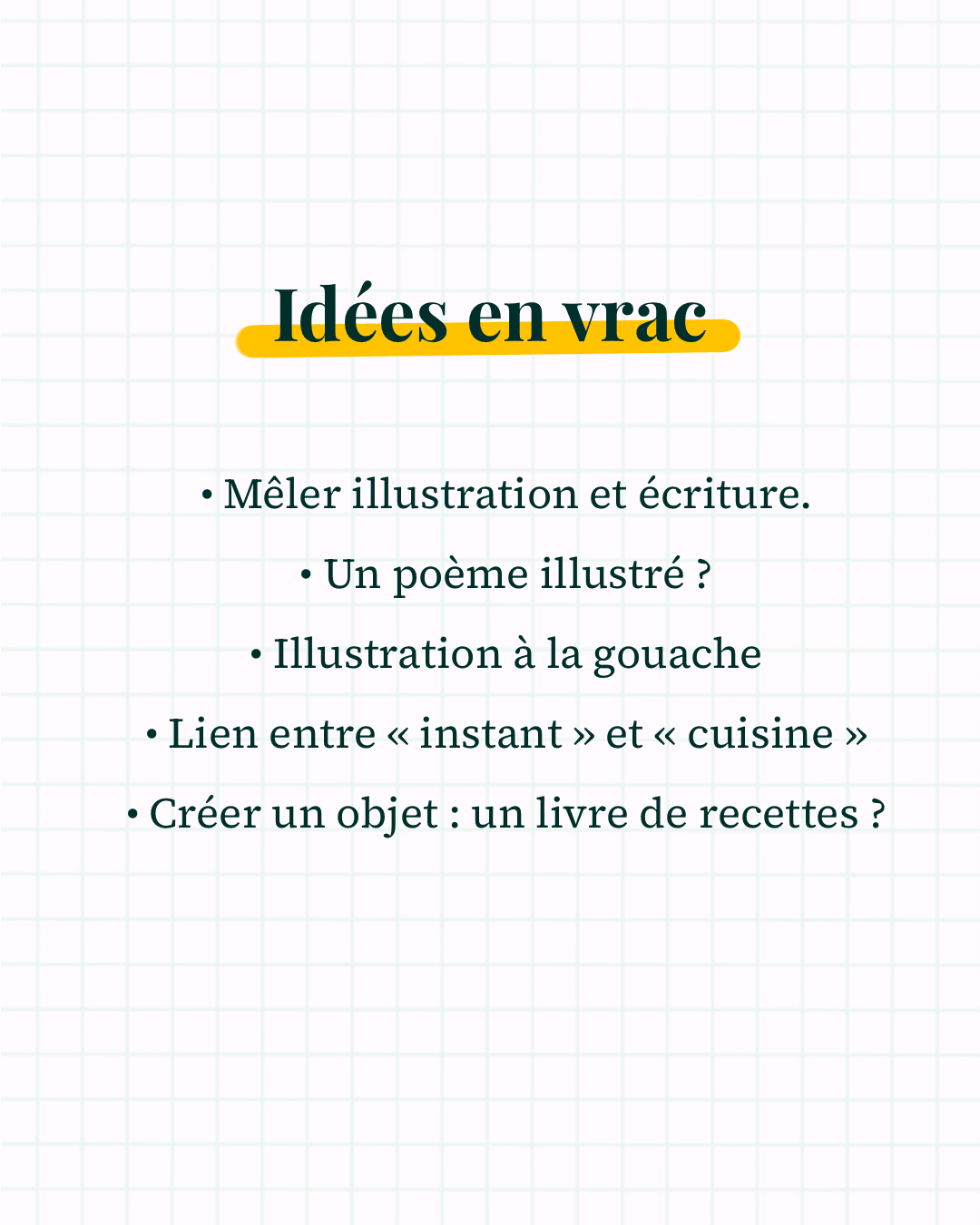 Mon idée, c’était de réaliser un poème illustré sur le thème de « l’instant gourmand ». J’ai donc écrit le texte – jusqu’ici tout allait bien. Puis j’ai réfléchi à la mise en page. Et là, je me suis bien cassé la tête ! 🤯 Je voulais trouver une manière dynamique d’intégrer le texte dans le dessin. J’ai fait des croquis, avec des cercles, avec du fouillis d’ingrédients… J’ai même pensé à dessiner une salade en écriture – c’est dire si je suis partie loin ! 🥗