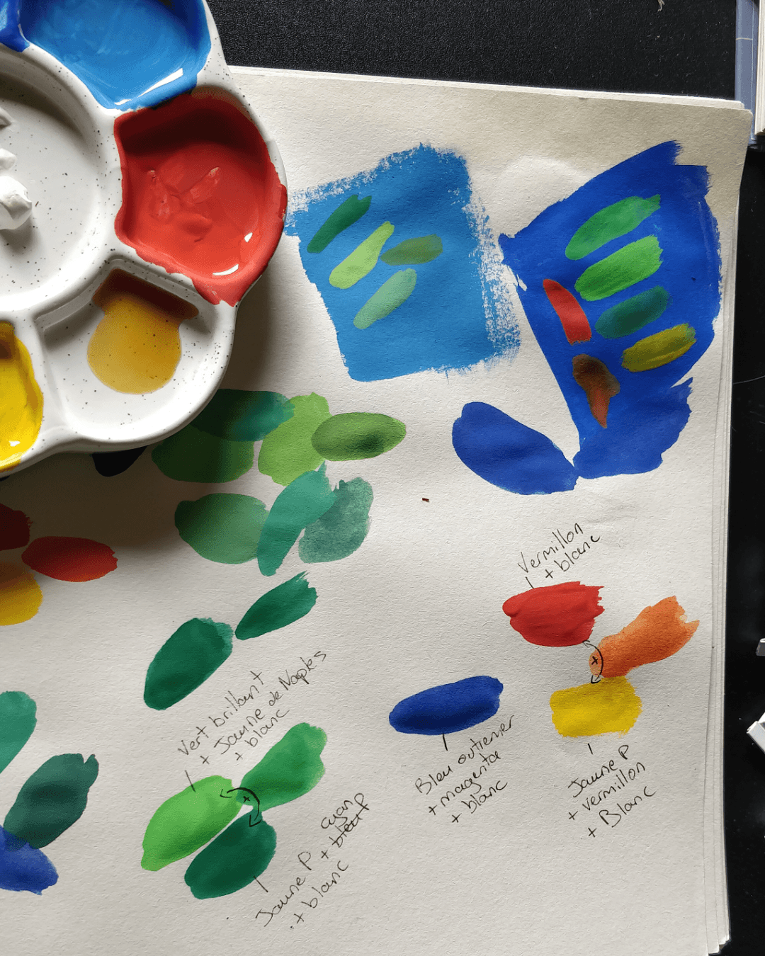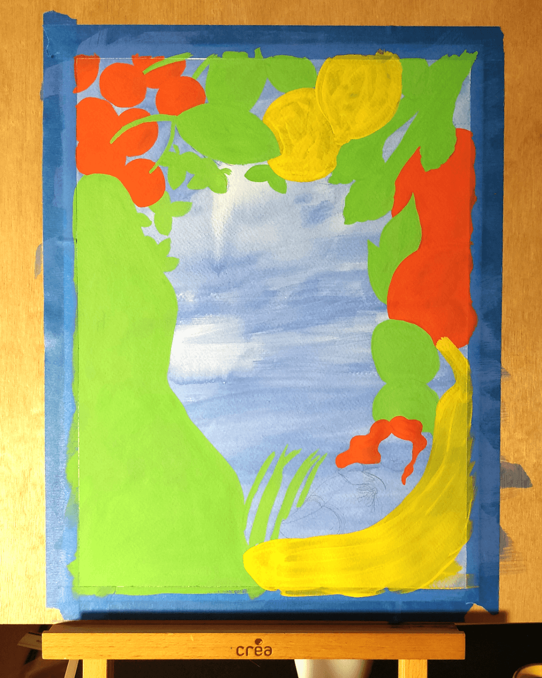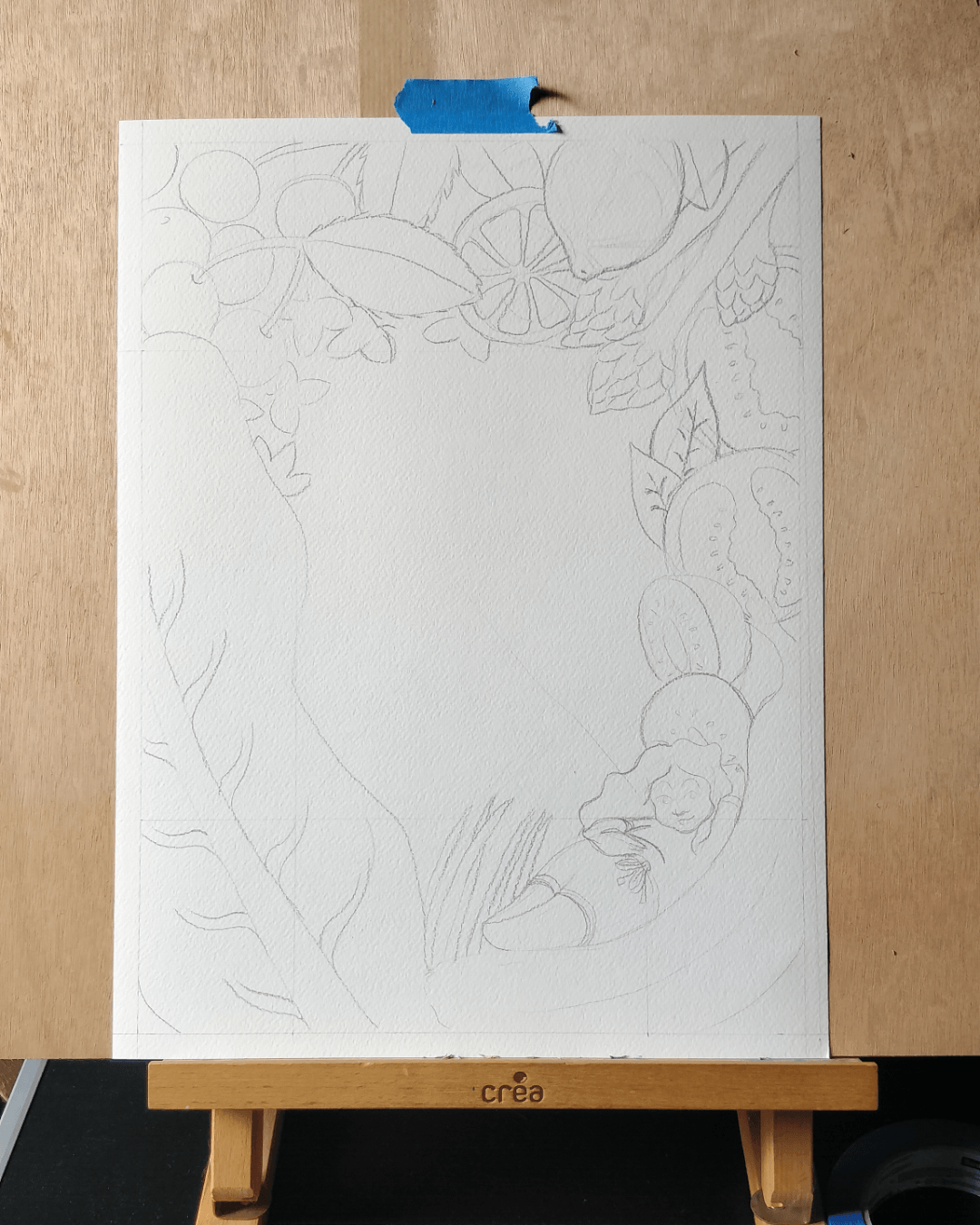 D’abord, j’ai esquissé le dessin. Ensuite, j’ai cherché mes couleurs. C’est un moment clé pour moi, auquel j’accorde une grande importance – si vous me suivez depuis un moment, vous connaissez mon amour des couleurs. Je les voulais vibrantes et gourmandes ! Puis j’ai peint une première couche moche, et je me suis efforcée de ne pas paniquer…