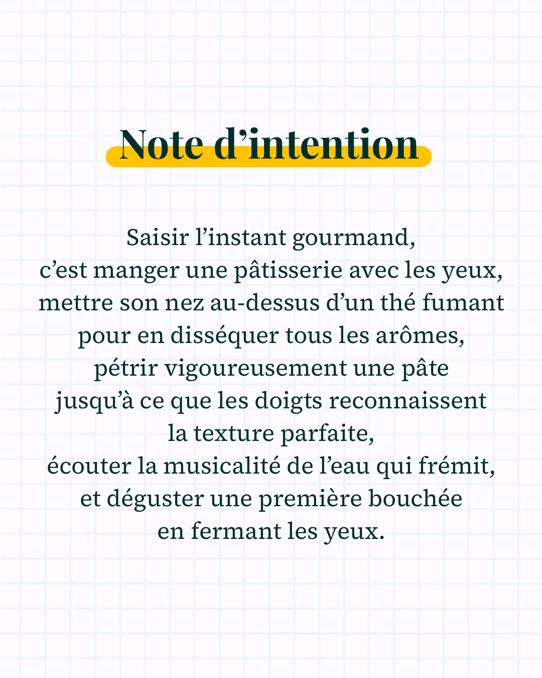 C’est ça que j’avais envie de transmettre : ce qu’il se passe quand le temps est suspendu, quand on accepte d’habiter pleinement son corps, et d’écouter ce que nos sens ont à nous dire. Quand on fait une pause pour regarder, écouter, sentir, toucher, goûter. Ces moments de grâce qui nous ressourcent, que l’on oublie parfois de vivre… et qui, pour moi, sont souvent synonymes de gourmandise !