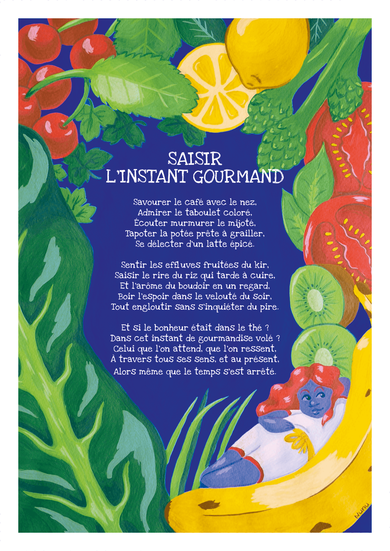 Après de nombreuses pages griffonnées, mon intention s’est naturellement dessinée. J’allais « saisir l’instant gourmand » à travers une création qui mélangerait écriture et peinture.