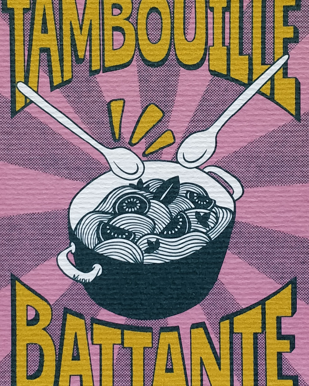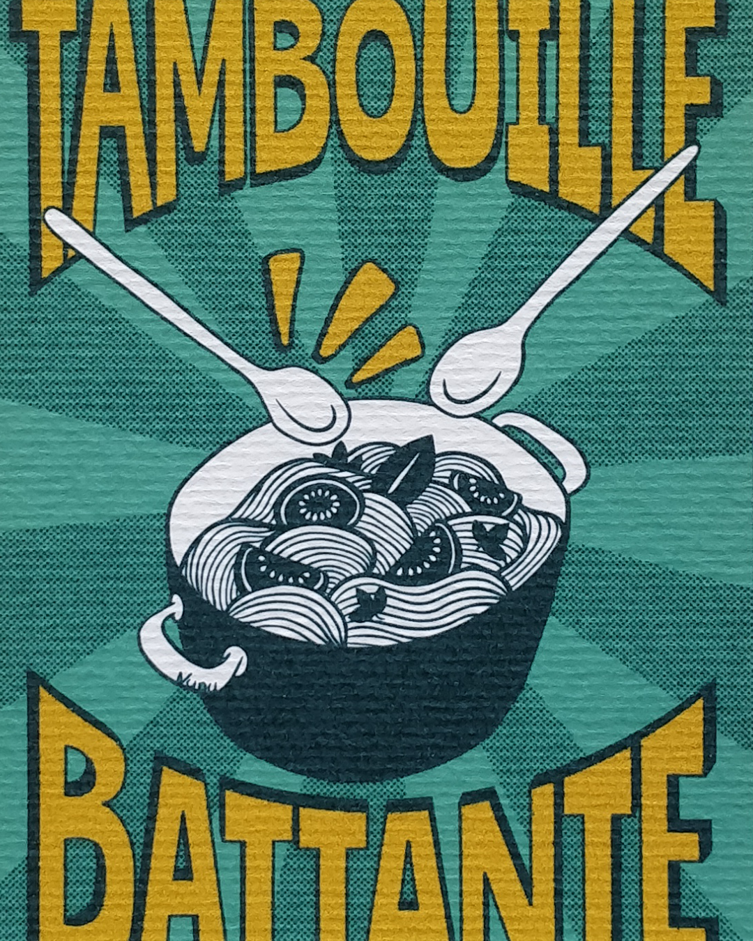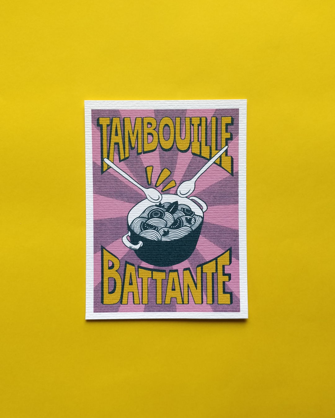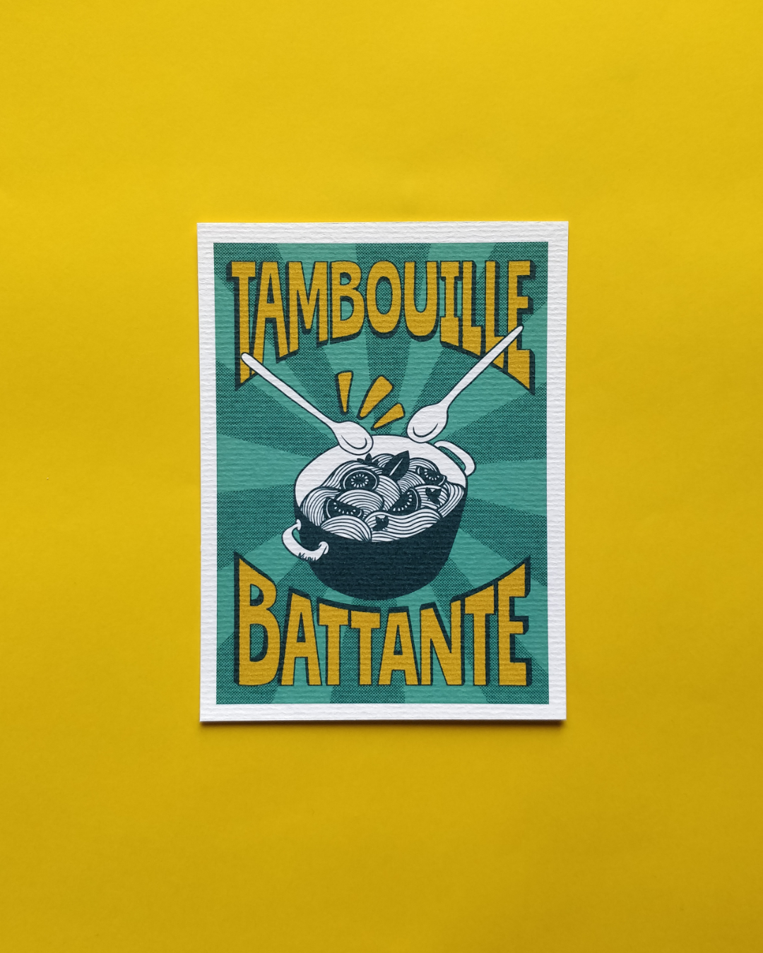 « Tambouille battante » doit sonner comme un cri du cœur, ou plutôt devrais-je dire du ventre ! 🥁 Elle annonce une effusion créative et culinaire. Cette carte postale est spécialement conçue pour envoyer des mots gourmands et mordants ! 😉🍡 Elle est imprimée par mes soins dans mon atelier, sur un joli papier épais et texturé.