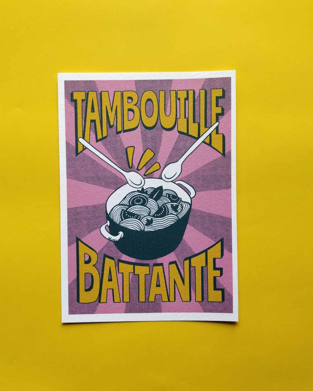 « Tambouille battante » doit sonner comme un cri du cœur, ou plutôt devrais-je dire du ventre ! 🥁 Elle annonce une effusion créative et culinaire. Je veux qu’elle mette du pep’s dans nos intérieurs, qu’elle nous donne envie d’assumer notre gourmandise et de mordre la vie à pleine dent ! 🦷 Elle est imprimée par mes soins dans mon atelier, sur un joli papier épais et texturé.