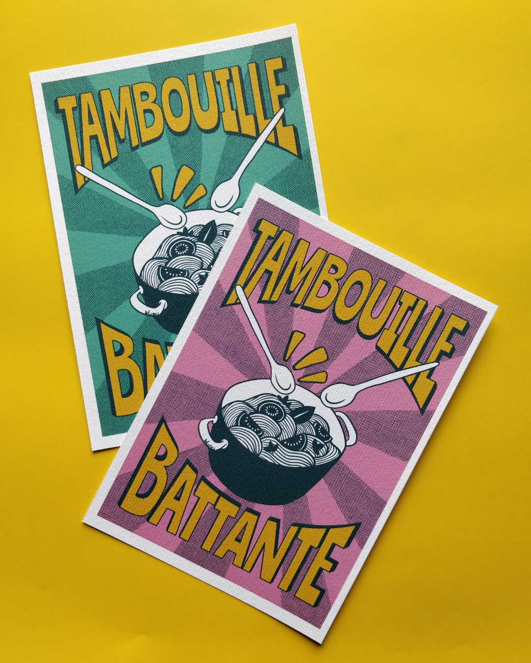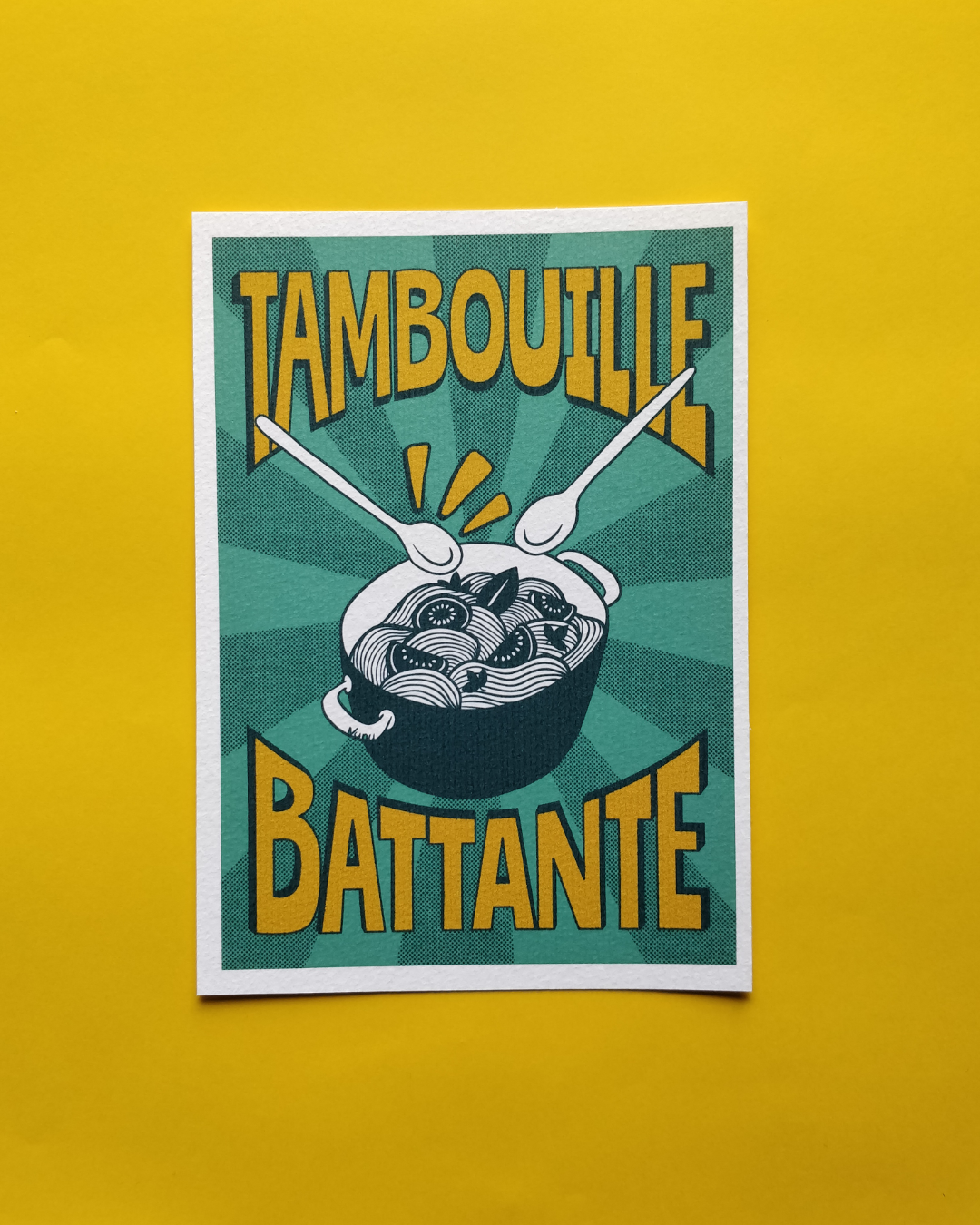 « Tambouille battante » doit sonner comme un cri du cœur, ou plutôt devrais-je dire du ventre ! 🥁 Elle annonce une effusion créative et culinaire. Je veux qu’elle mette du pep’s dans nos intérieurs, qu’elle nous donne envie d’assumer notre gourmandise et de mordre la vie à pleine dent ! 🦷 Elle est imprimée par mes soins dans mon atelier, sur un joli papier épais et texturé.